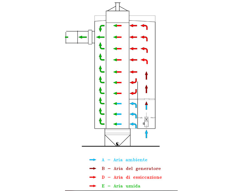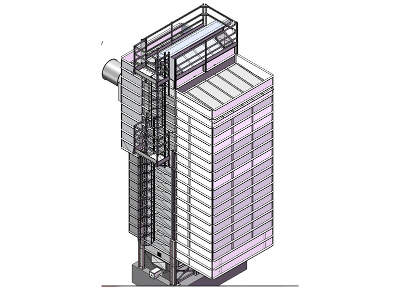 The drying column is composed of self-supporting panels in galvanised sheet steelwith external pilars which number varies according to the machine height; the ducts are fixed to the panels by means of 8 bolts each, so that a particularly strong structure is created.